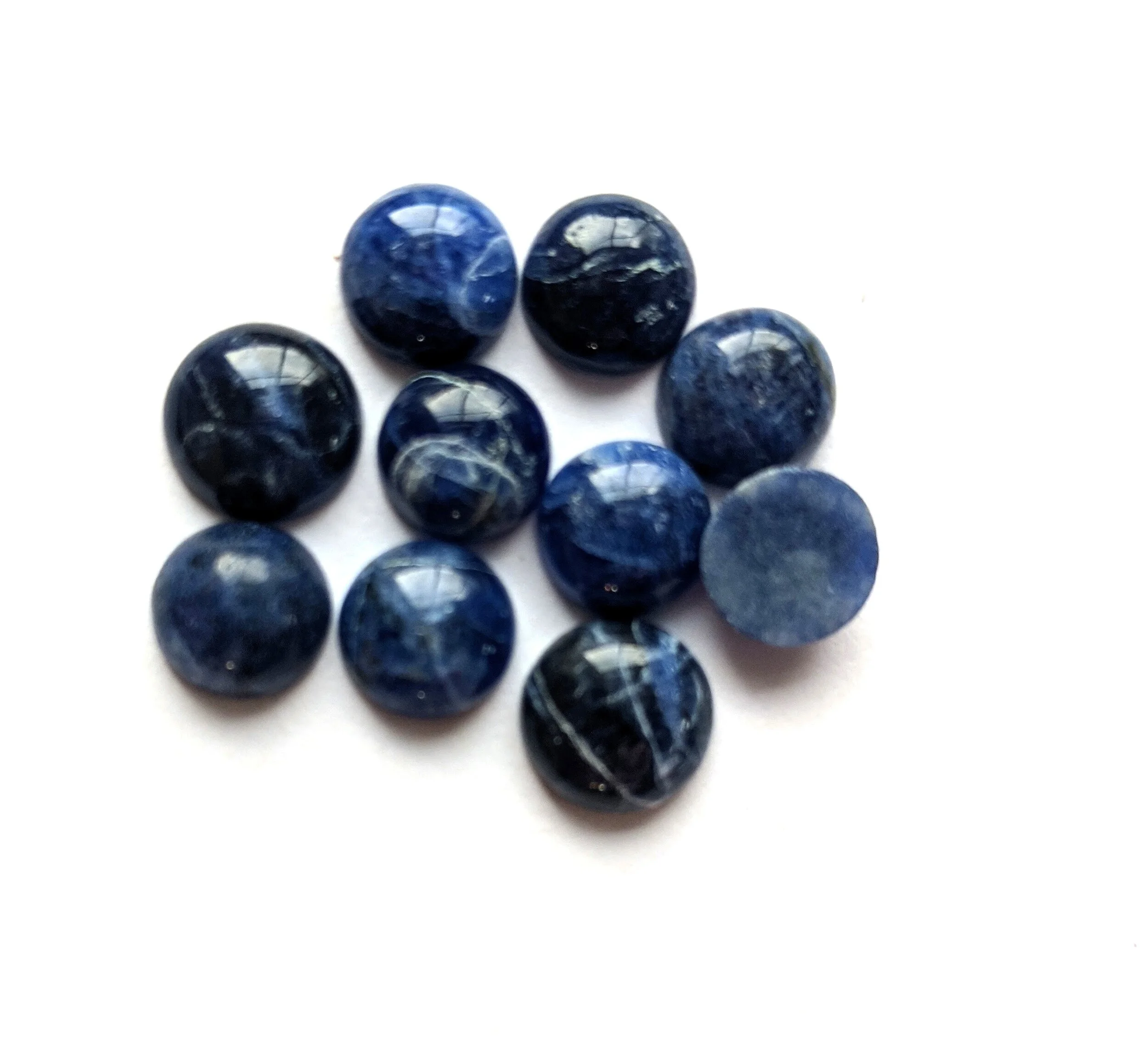 Delight in the charm of these tiny vintage sodalite button cabochons, perfect for adding a touch of natural beauty to your designs. Each cabochon features the stunning blue and white variations that make sodalite so unique. Their petite size and smooth shape bring to mind the candy dots we loved as kids, adding a nostalgic touch to their appeal.