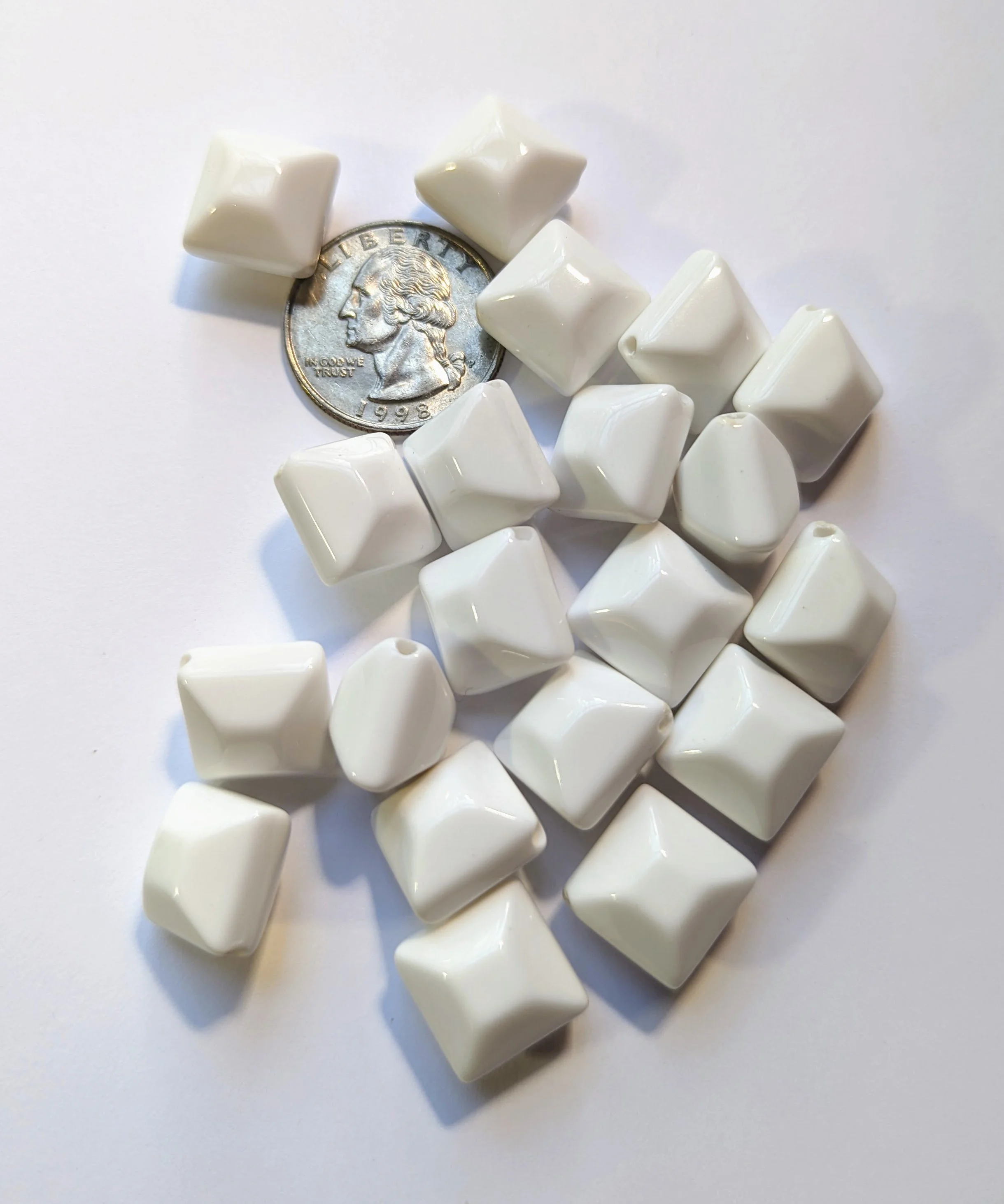 These Vintage White Acrylic Diamond Pillow Beads are full of surprises! Made in the 1970s, they defy expectations with their weighty feel and striking design. Their unique cross-drilled shape transforms them into dazzling diamonds, while their depth adds an unexpected dimension of elegance.